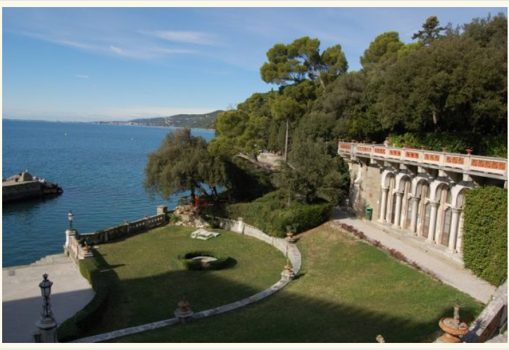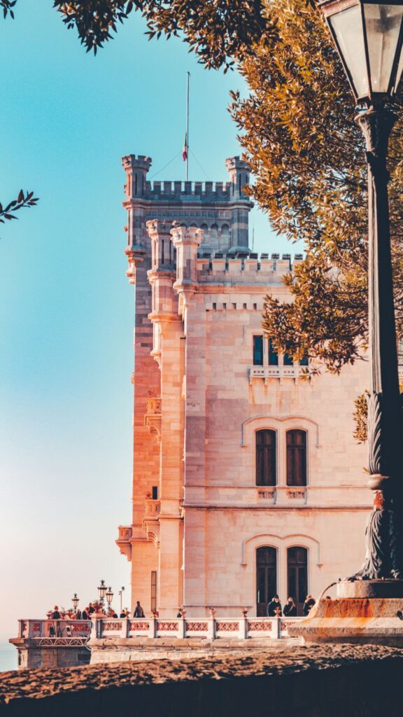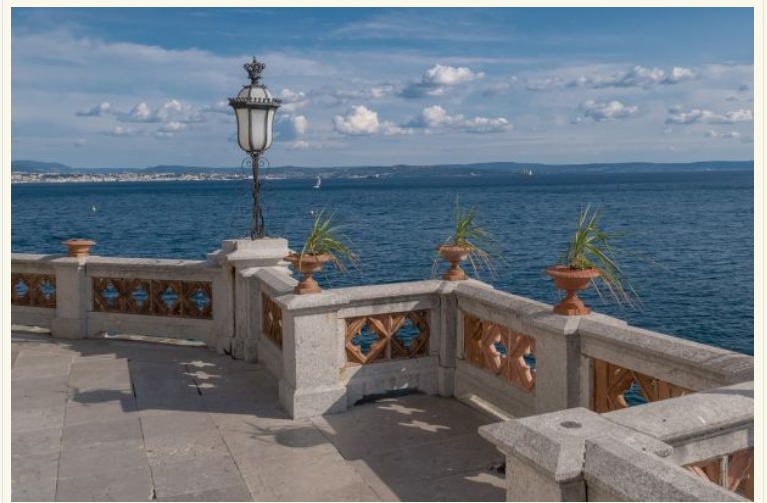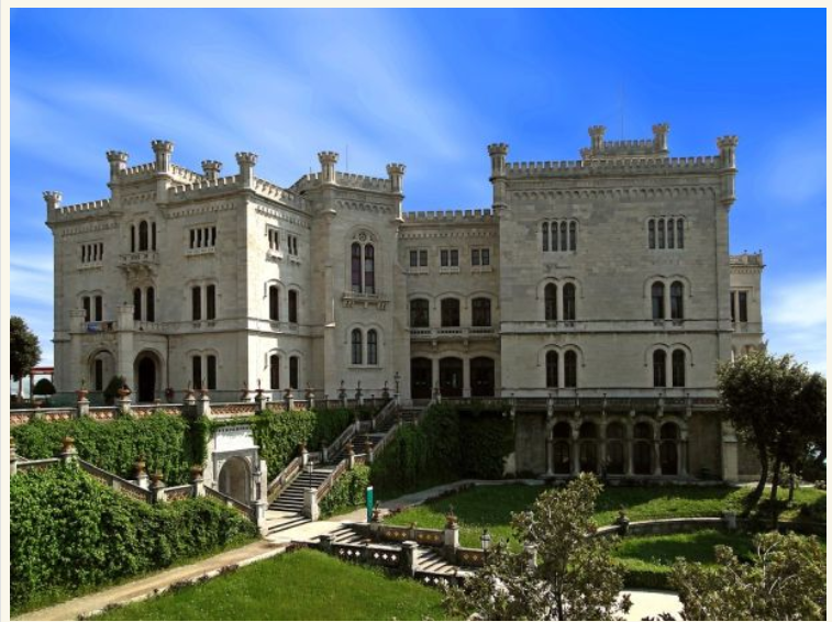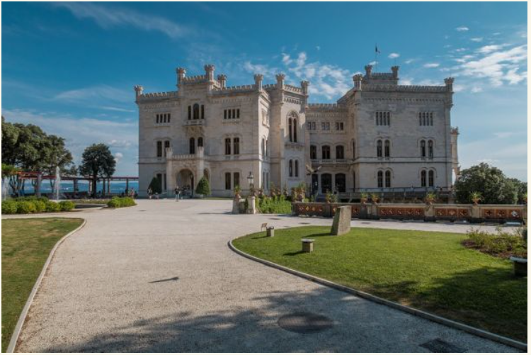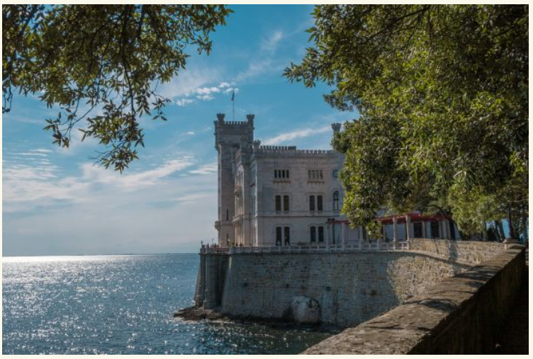 На камена карпа на брегот на Трстскиот Залив, се наоѓа прекрасниот бел замок Мирамаре, каде што е задоволство да се прошета низ големиот и внимателно уреден парк, во чиј внатрешен дел има смирувачки фонтани и вообичаените потпорни згради наречени мал замок и штали.